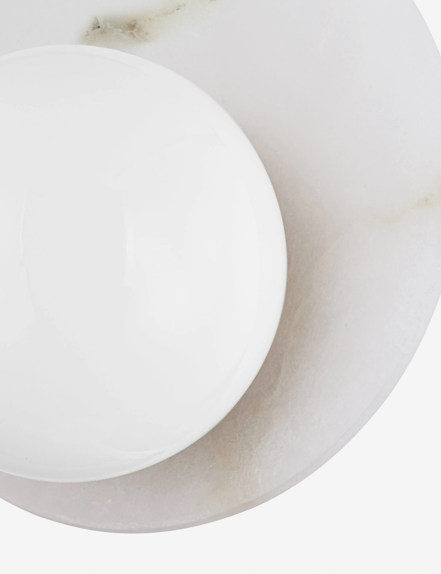 The Athena sconce evokes the timeless beauty of elemental materials. The minimalist design features an opal glass shade set on an alabaster plate, filtering and reflecting a warm light off the translucent stones. With its soft, tonal look, this sconce light can blend into a variety of styles for a refining touch.