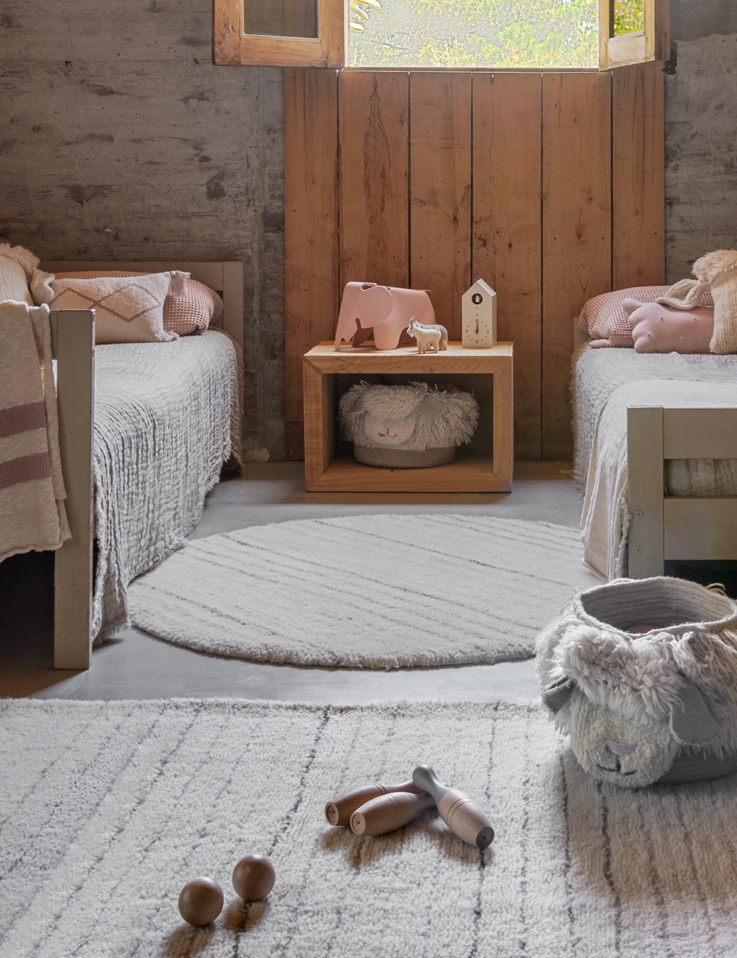 Lorena Canals brings the durability and softness of wool to a patented washable design for a luxurious, easy-care area rug. This round rug’s hand-tufted pile features a striped design with accent tassels offering a chic edge. Enjoy the plush natural touch underfoot and launder again and again for always fresh style.