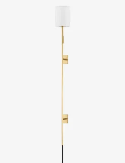 A long, slim profile featuring two square wall mounts and a white Belgian linen shade lends this wall sconce a neat sophistication. With its plug-in base and narrow design, this is a versatile option for refined lighting in a dynamic space. An antique brass finish will elevate your space with easy splendor.