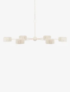 The Kiri chandelier will elevate your overhead lighting with an elegant statement piece. The all-white finish and streamlined profile set a modern tone that seamlessly folds into your design with a bright appeal. The shades are made from recycled paper—braided and wrapped for a good pop of texture in this hub and spoke chandelier design.
