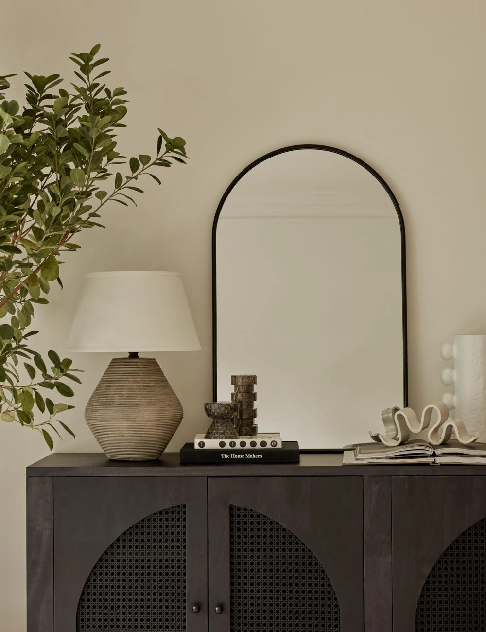 A simple, timeless wall mirror you can add to any room, featuring a metal frame with rounded corners and an arched design.