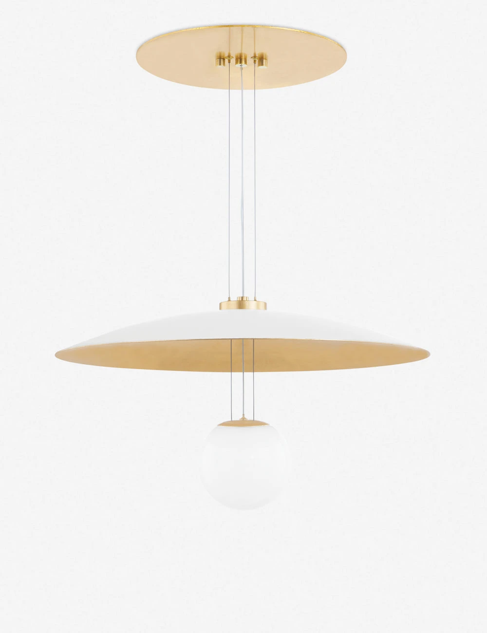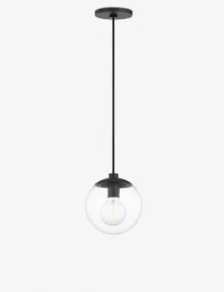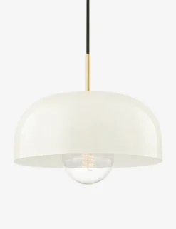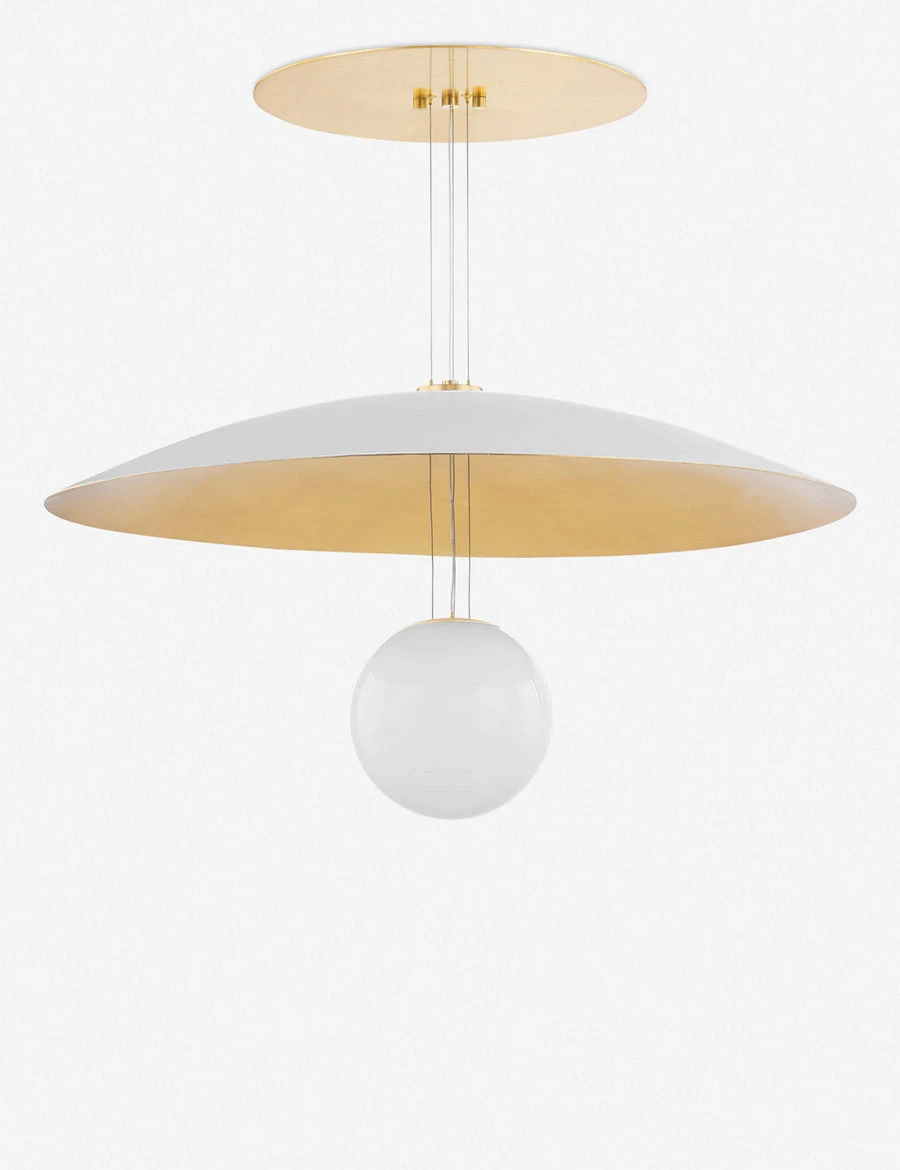 Clean lines create a striking modern tone in this hanging light fixture. The two-tone shade and suspended globe fashion this pendant light with a dynamic silhouette for bright appeal overhead.