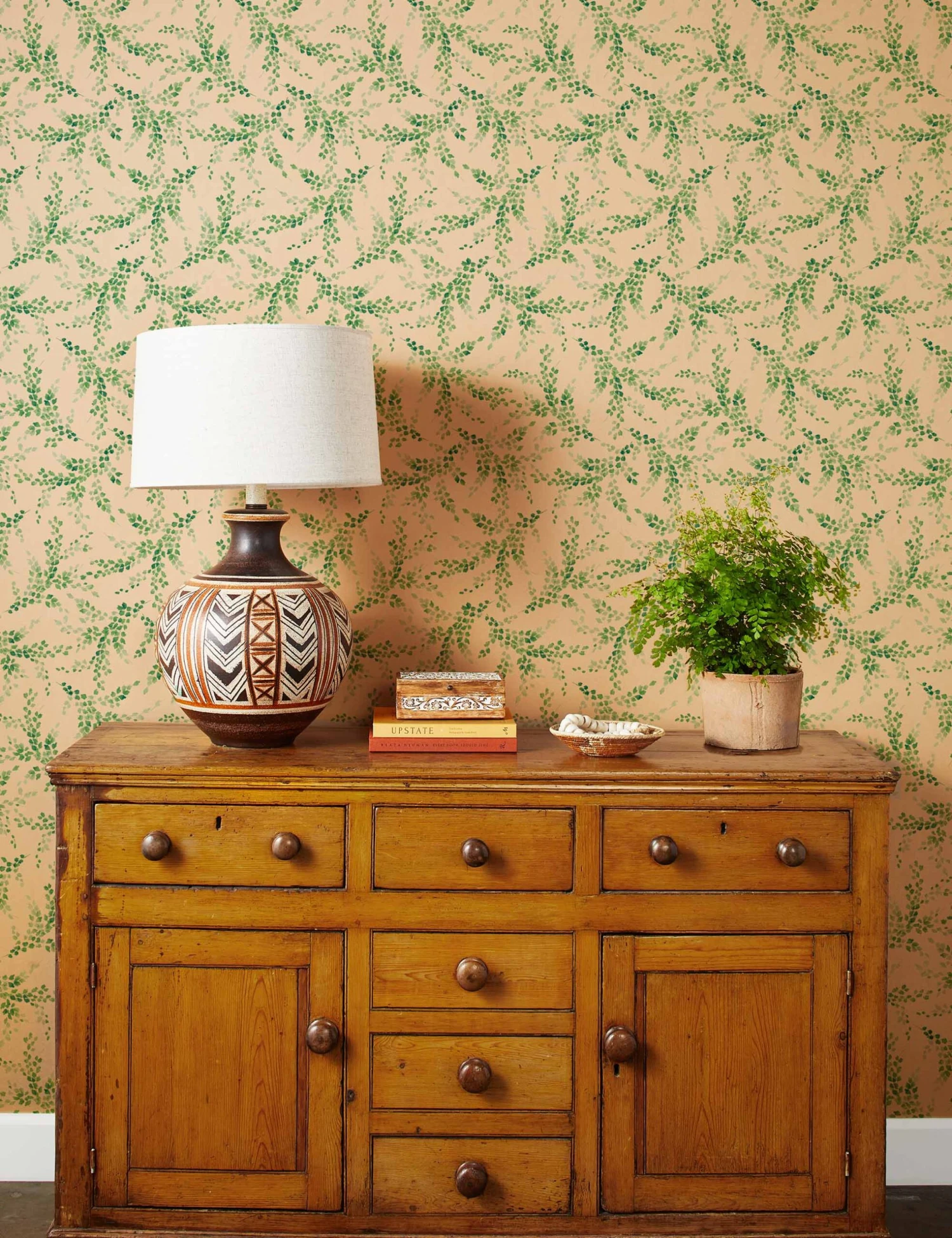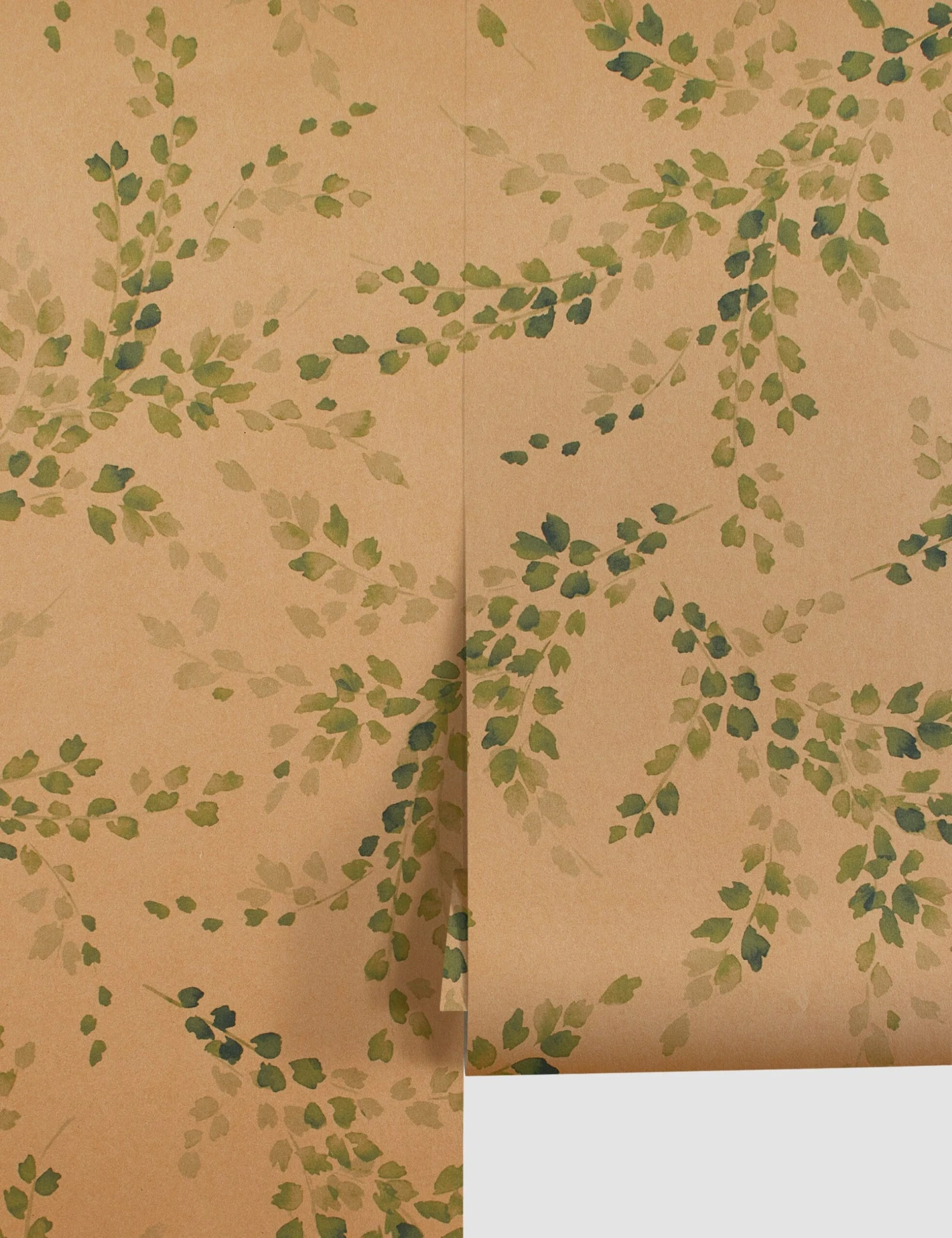 Delicate green vines create a soft botanical motif on a sepia backdrop in this wallpaper design. This versatile home wallpaper is perfect for adding a fresh take on vintage-inspired appeal to a bathroom or living space.