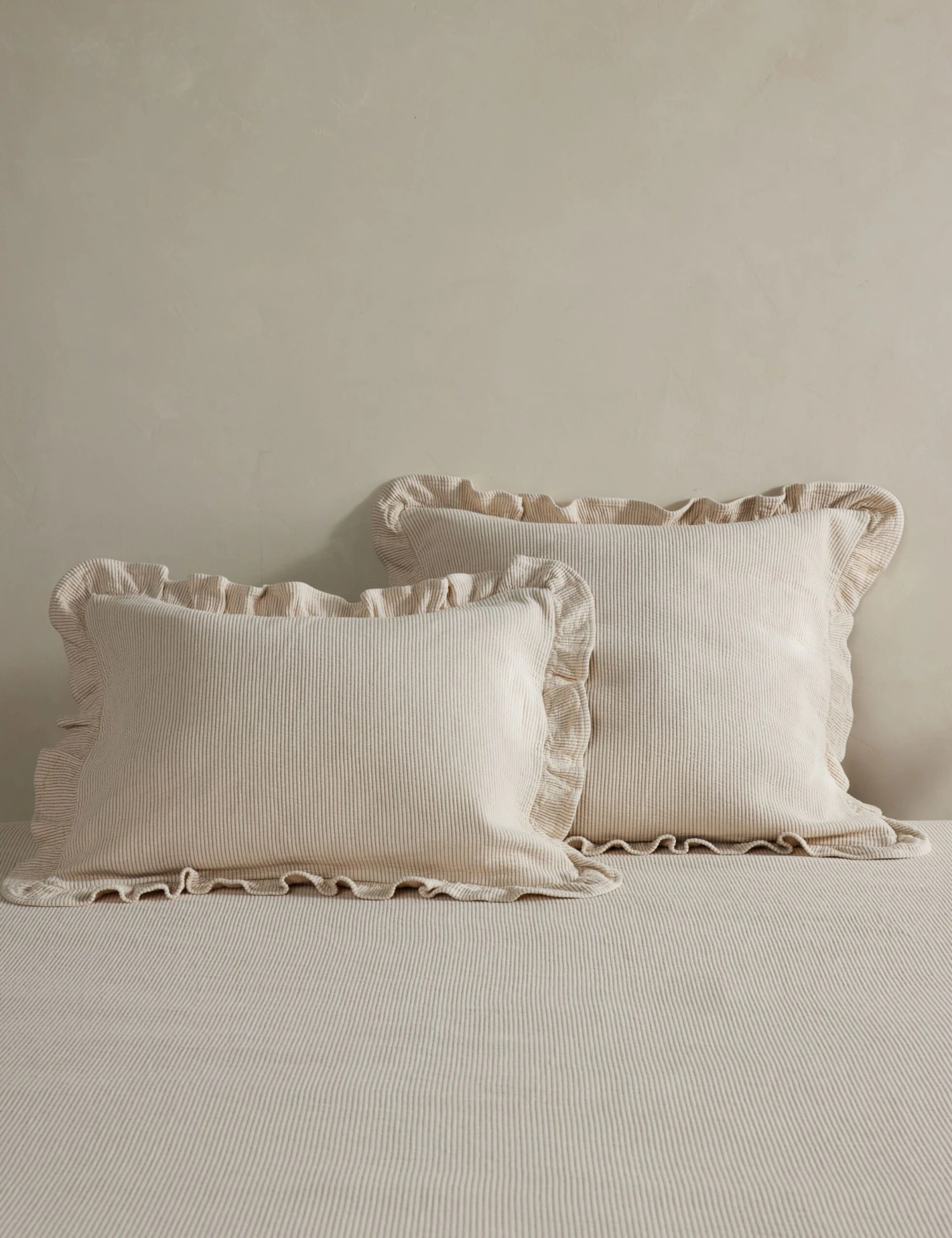 Soft, textural, and chic—the Vekki sham is the perfect addition to a cozy bed set. The ruffled flange offers an inviting feel set for charm in a timeless curation. This piece is from our exclusive Sarah Sherman Samuel collaboration and features all the trademarks of her warm, edited style.