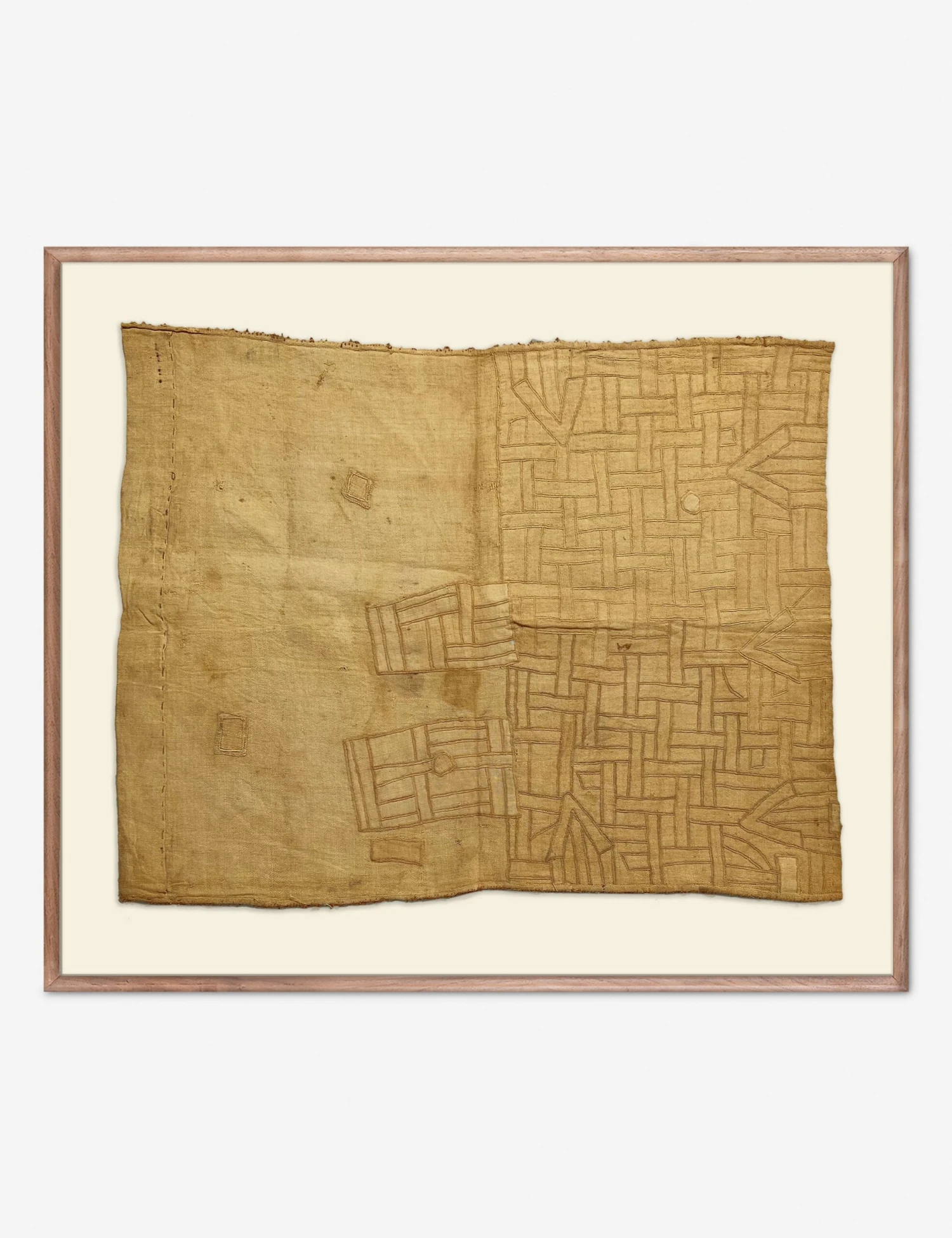 Bring a singular touch to your wall decor with this one-of-a-kind cloth from Congo. The word Kuba means lighting and refers to the blades once used by Kuba warriors. Each cloth is handcrafted using traditional techniques—first woven on a small loom, then embroidered with their tactile design—before being floated in a walnut frame for a truly unique piece of textile wall art.